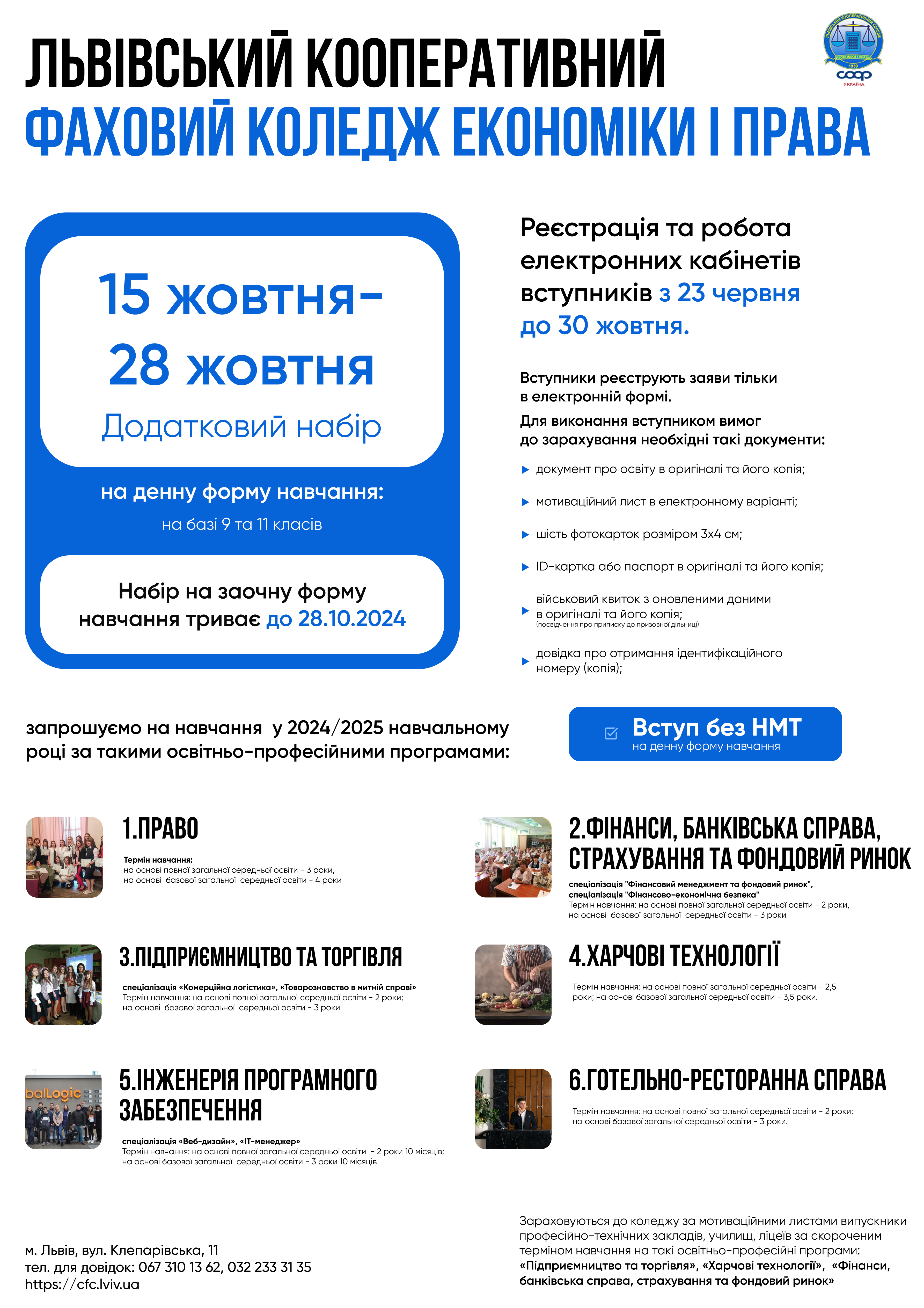 Львівський кооперативний фаховий коледж економіки і права розпочинає додатковий набір на денну форму навчання на базі 9 і 11 класу без НМТ з 15.10-28.10.24р.