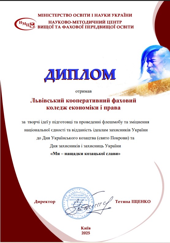 Наш навчальний заклад – Львівський кооперативний фаховий коледж економіки і права – отримав ДИПЛОМ від Міністерства освіти і науки України та ДУ «Науково-методичний центр вищої та фахової передвищої освіти»! Цю високу нагороду ми здобули за творчі ідеї підготовки та проведення флешмобу, спрямованого на зміцнення національної єдності та відданість ідеалам захисників України. Захід проходив у рамках щорічної естафети єдності «Ми – нащадки козацької слави», приуроченої до Дня Українського козацтва (свято Покрови) та Дня захисників і захисниць України. Особлива подяка нашій талановитій студентці групи ПВ(н)-24, Софії Коноваленко! Саме її творчий доробок став частиною нашої участі у флешмобі. Софія долучилася до патріотичної ініціативи, декламуючи власний вірш «Під покровом Пресвятої Богородиці», вкладаючи в нього свою любов до України та повагу до наших захисників. Це визнання підтверджує, що наші студенти – не лише майбутні фахівці, а й свідомі, талановиті та патріотичні громадяни! Щиро дякуємо Софії за її внесок та вітаємо всю спільноту Коледжу з цією перемогою! Слава Україні! Слава її Героям!
